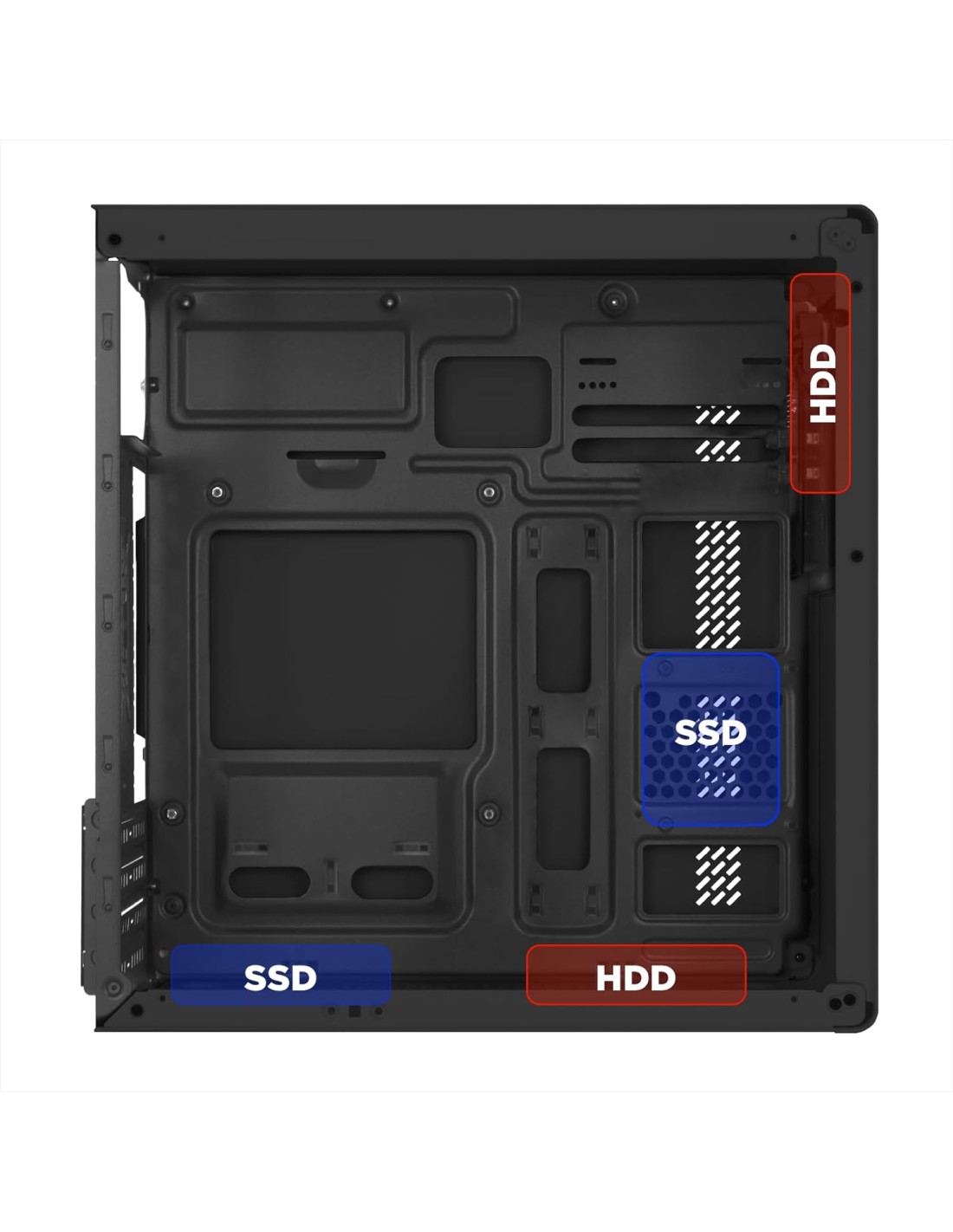 Il case supporta schede madri MicroATX e Mini-ITX, può ospitare fino a quattro dischi rigidi, tra cui 2 HDD da 3,5’’ e 2 SSD da 2,5’’, è in grado di equipaggiare schede grafiche fino a 300 mm di lunghezza, CPU COOLER fino a 140mm di altezza e dispone di 4 slot di espansione.
